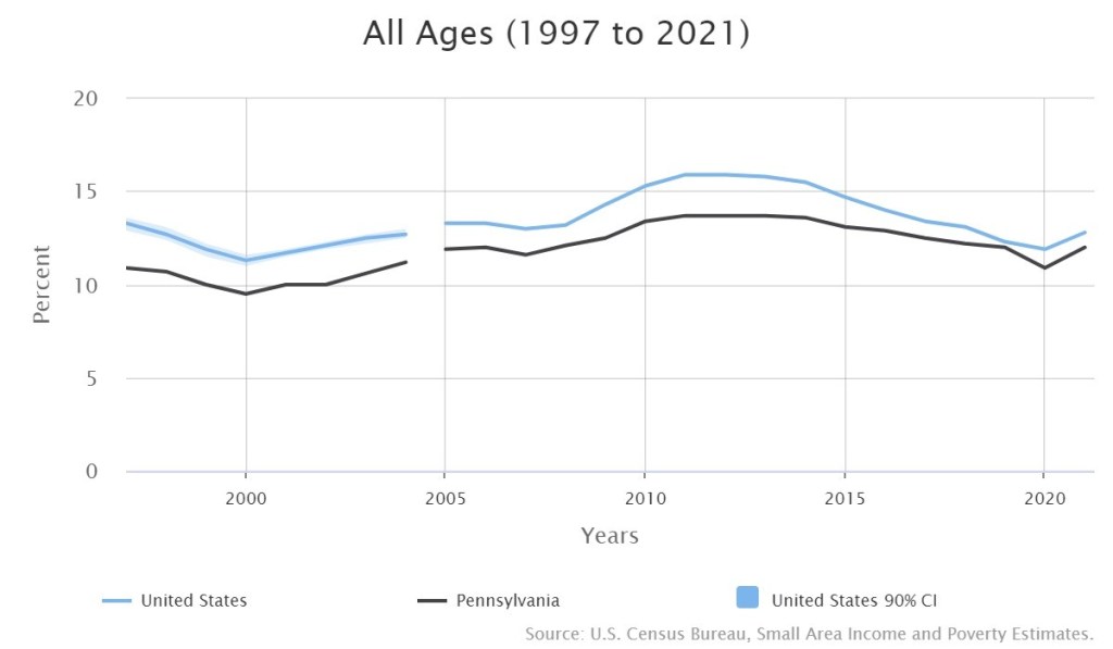 The poverty rate in Pennsylvania from 1997-2021. Data from U.S. Census Bureau. Read more